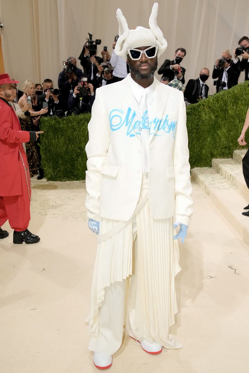 Skirt or suit? Why pick one when you can have both, as Virgil Abloh shows? Bonus points for the rabbit ear hat.