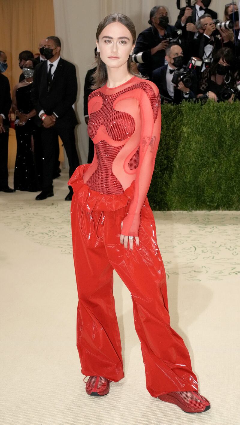 Now this is an outfit that you wear after a year and a half indoors. Julia Garner mixed all the naked trends: see-through, leotard, an ab-slit by the famously American designer Stella McCartney.
