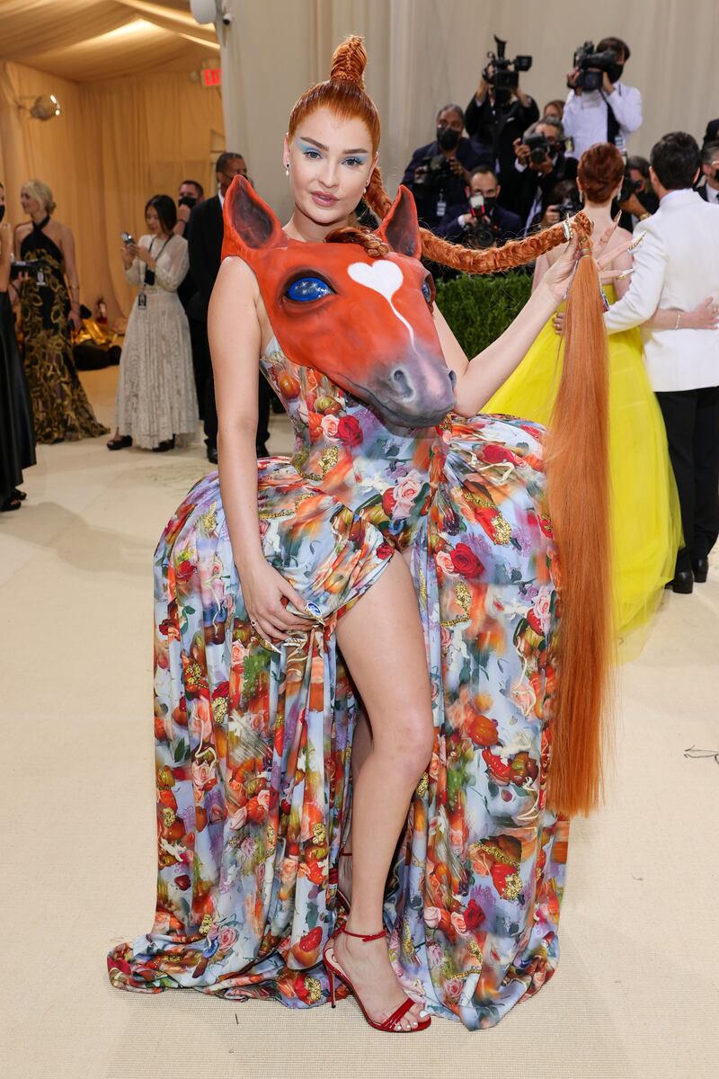 Kim Petras wore the cool person label of the moment, Collina Strada, to pay her respects to “horse girls.” The designer, Hillary Taymour, also wore a horse around her neck. Both were based on her ponies from childhood, named Justin and Kangaroo. It took four hours for Petras to get ready, probably due to her extra-long braid. Fashion!