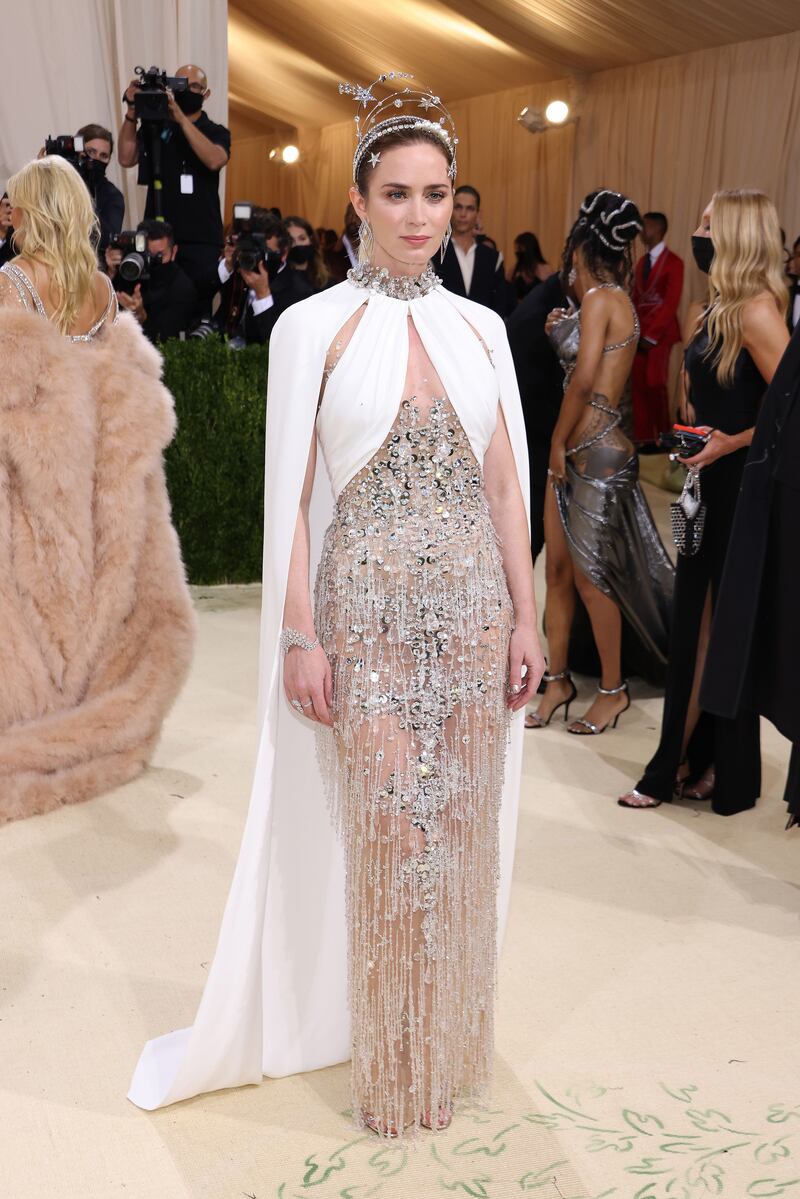 Timothée Chalamet, a co-chair this year, wore white, with dashes of black on the collar to add drama—a short waiter’s jacket, loose-then-tapered trousers, and white sneakers. Some jewels casually on the waist. He really does thoughtfully dress for his gay fanbase, time after time.