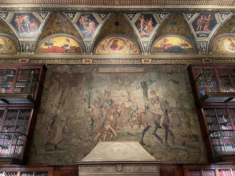 Walking into the library room of the Morgan Library & Museum, the eye is drawn upward. Three levels of colorfully-bound books, many priceless and irreplaceable, sit safely behind sumptuous walnut, bronze, and glass cases. The rich color scheme carries through to the ceiling, where artist Harry Siddons Mowbray depicts the various artforms alongside the twelve signs of the Zodiac. The room is dramatically dim, the only natural light pouring in from a solitary northern window. But this wasn’t the original plan. There are actually two more windows flanking the fireplace, buried behind the books.