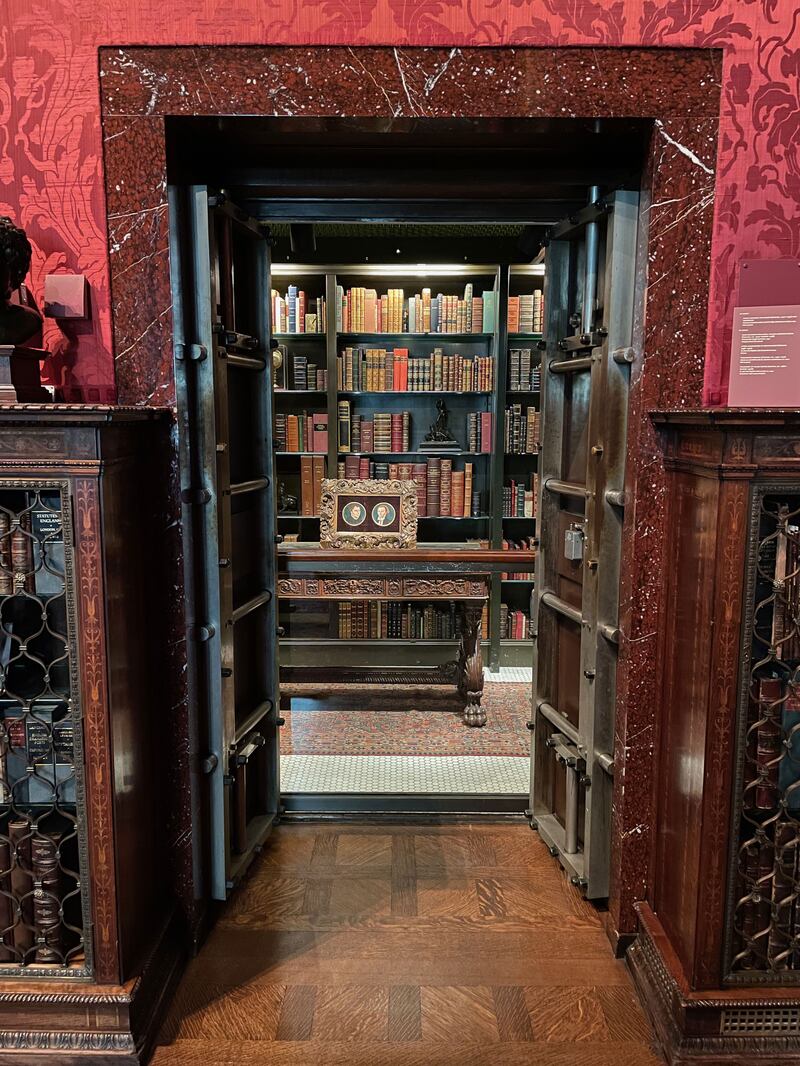 The library’s exterior is made of Tennessee pink marble, constructed employing interlocking techniques such that virtually no mortar was used. Set back from the street behind an imposing gate, the entrance is flanked by stone lions sculpted by Edward Clark Potter (1857-1923), who would later produce “Patience and Fortitude,” the lions outside the New York Public Library’s main branch on Fifth Avenue. Construction on the Morgan Library was completed in 1906 after four years of intense secrecy and widespread curiosity. No members of the press or public were allowed inside, and speculation swirled as to what treasures hid within the building’s four-foot-thick walls.