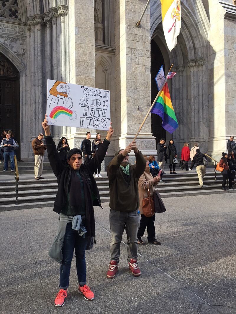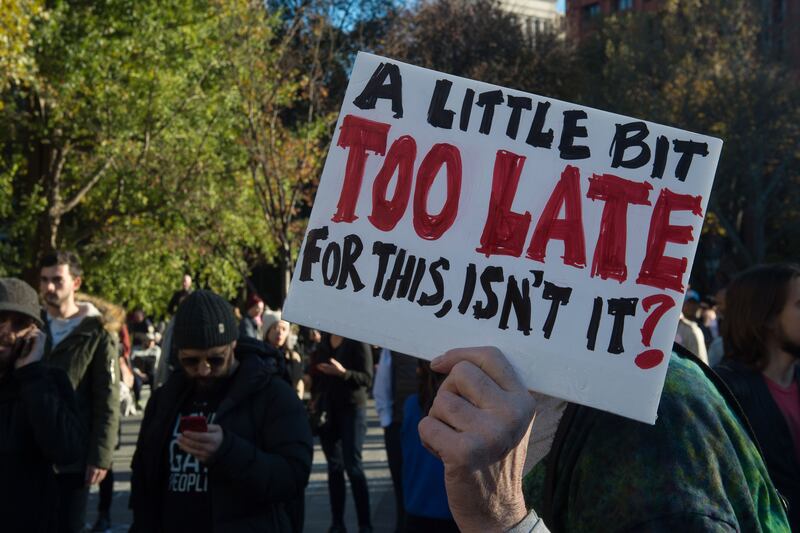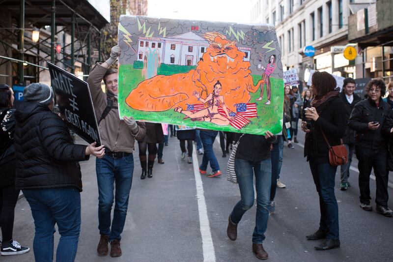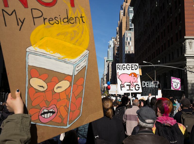 An activist holds up a sign during the Trump protest in Manhattan, New York City, Nov. 12, 2016.