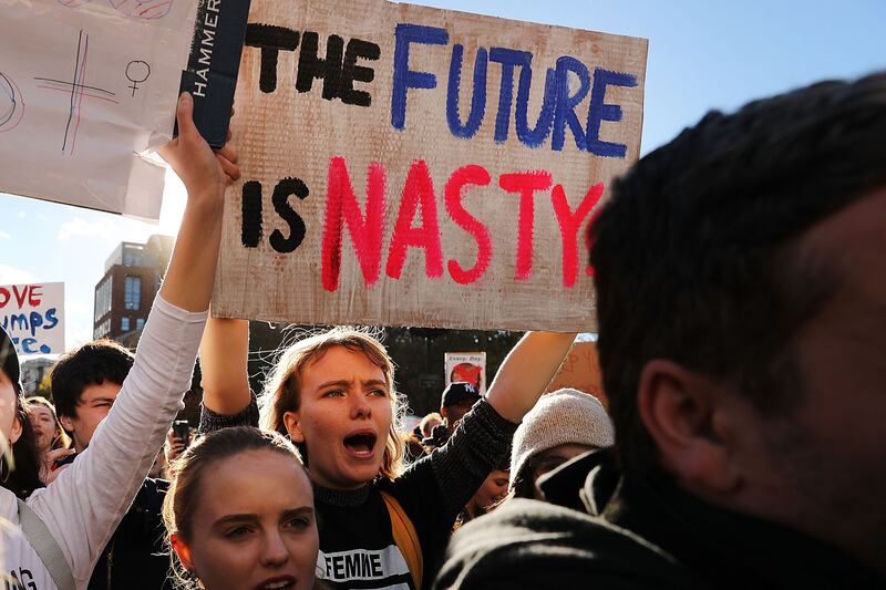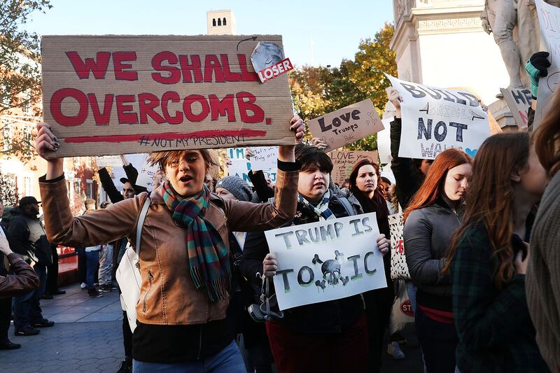 Hundreds of anti-Donald Trump protesters hold a demonstration in Washington Square Park as New Yorkers react to the election of Donald Trump as president of the United States on November 11, 2016 in New York City. The election of Trump as president has sparked protests in cities across the country.