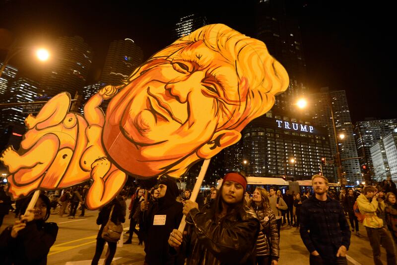 People take part in a protest near Trump Tower, against President-elect Donald Trump, in Chicago, Illinois on November 9, 2016.