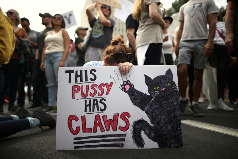 A man holds a sign depicting Trump assaulting Lady Liberty during the anti-Trump protest November 12, 2016 in New York City.