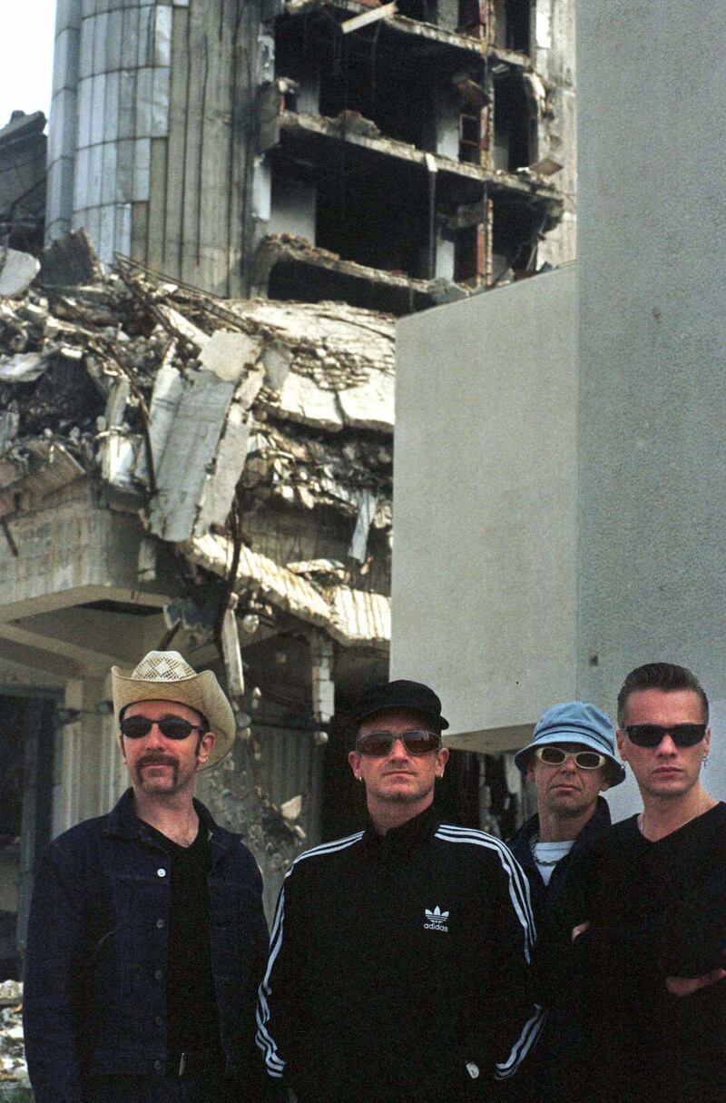 U2 members Bono Vox (2L), The Edge (L), Adam Clayton (2R) and Larry Mullen Jr.(R) stand in front of war-shattered building of Sarajevo's newspaper Oslobodjenje September 24, 1997.