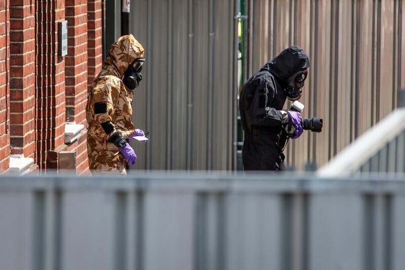 Emergency workers in protective suits search a house in Salisbury, England, after a man and woman were exposed to the deadly Novichok nerve agent in July 2018, several months after the poisoning of the former Russian spy Sergei Skripal and his daughter, Yulia, in the same town.