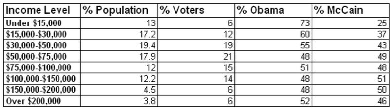 If all income groups had voted evenly, Obama would have beaten McCain 55.2 percent to 42.7 percent, a net gain of 5.3 points relative to what actually happened. So no, poor government program beneficiaries don’t “all vote” or turn out in “massive numbers”.