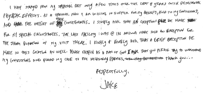 The motion included a hand-written plea from Chansley stating that, for eight years, he has only eaten “traditional food that has been made by God.” “Being w/o food is stressful due to the way it affects my serotonin levels,” Chansley wrote to prison officials. “I am humbly requesting a few organic canned vegetables, canned tuna (wild caught), or organic canned soups.”