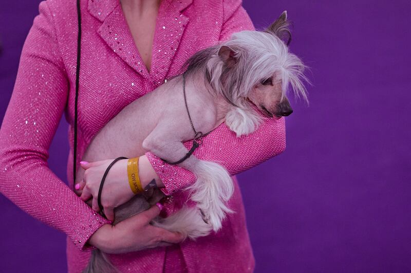A handler holds Chinese Crested dog at the 149th Annual Westminster Kennel Club Dog Show Andres Kudacki/Getty Images