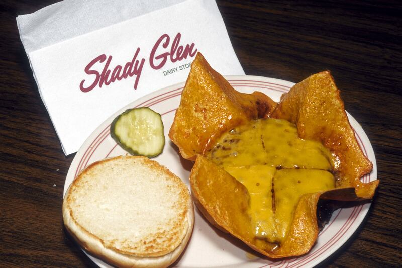 There's no secret to how Shady Glen cheeseburgers are made. You can sit at the counter, slurp a superb milk shake, and watch the action. On a high-temperature electric grill, a modest-size patty of fairly lean beef (90%) is cooked on one side and flipped. It is then blanketed with four square slices of bright orange cheese. The cheese is arranged so that only about one-quarter of each slice rests atop the hamburger. The rest that extends beyond the circumference of the meat quickly melts down onto the surface of the flattop. At the precise moment when the grilling cheese begins to transform from molten to crisp, the cook uses a spatula to disengage it from the hot iron and curl it above the meat like pliant arches on some fantastic imperial burger crown. The folded-up petals of cheese, which may be topped with condiments and somewhat awkwardly crowned by a bun, are crunchy at their tips, chewy just below, and creamy-soft where they melt into the surface of the hamburger.