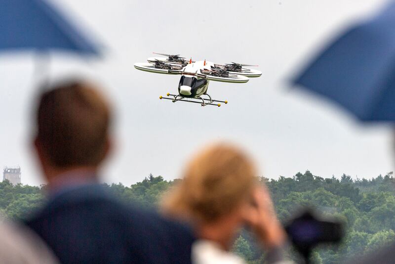 A test flight of a "CityAirbus" flying taxi model.