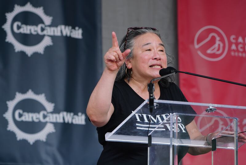 Tina Tchen speaks at a demonstration in 2021.