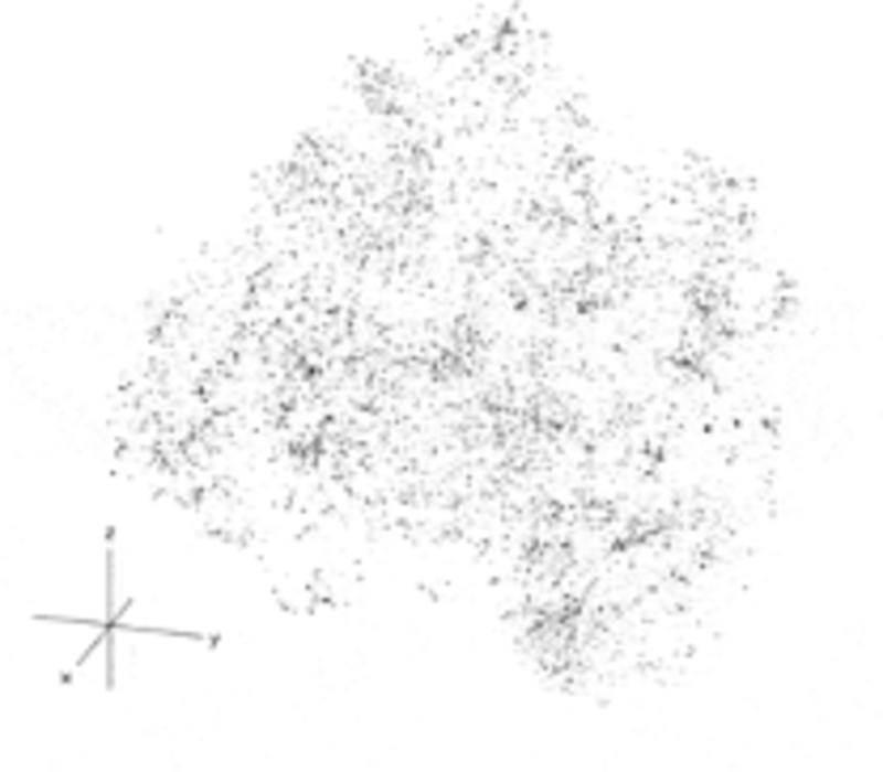 For example, he explained: “ice” occurs often next to “cold,” but rarely does “ice” occur next to “chair.” This gives the computer a hint that “ice” and “cold” are semantically related in a way that “ice” and “chair” are not. Using written language to find these patterns of association, the neural network could embed each word into a map of the relationships of all the words in a language. I pictured this as a sort of star chart where each star was a word and each constellation within the galaxy of the language represented how those words were used relative to one another. It’s actually impossible to visualize these “galaxies,” as the numbers of words and their myriad geometric relationships mean they have hundreds of dimensions. But here is Britt and Aza’s example of the top ten thousand most spoken words in English compressed down to a 3D picture.