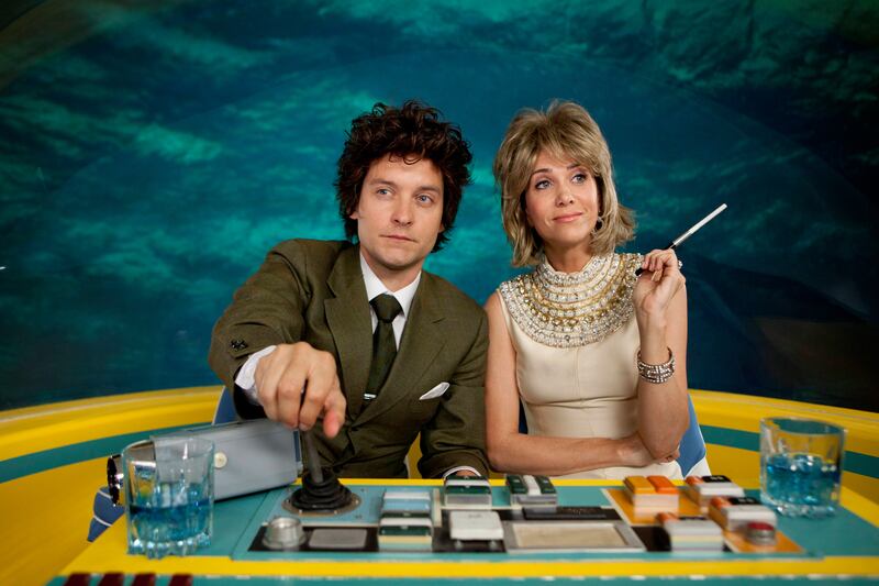 The action opens with a bang—or two. Inside a mansion, a woman (Kristen Wiig, in a fabulous ‘70s-era blond wig) stands between two men pointing guns at one-another, played by the aforementioned Maguire and Haley Joel Osment (of The Sixth Sense fame). There are two gunshots, followed by a deafening scream. Maguire, with a bullet wound to the gut, stumbles out of the house, hops into a convertible, and—casually smoking a cigarette—speeds away to the giant office of Morehouse Conglomerated. There, in his empty office, he tells his story to a Dictaphone (channeling Double Indemnity) of how he became “Devin Morehouse.”