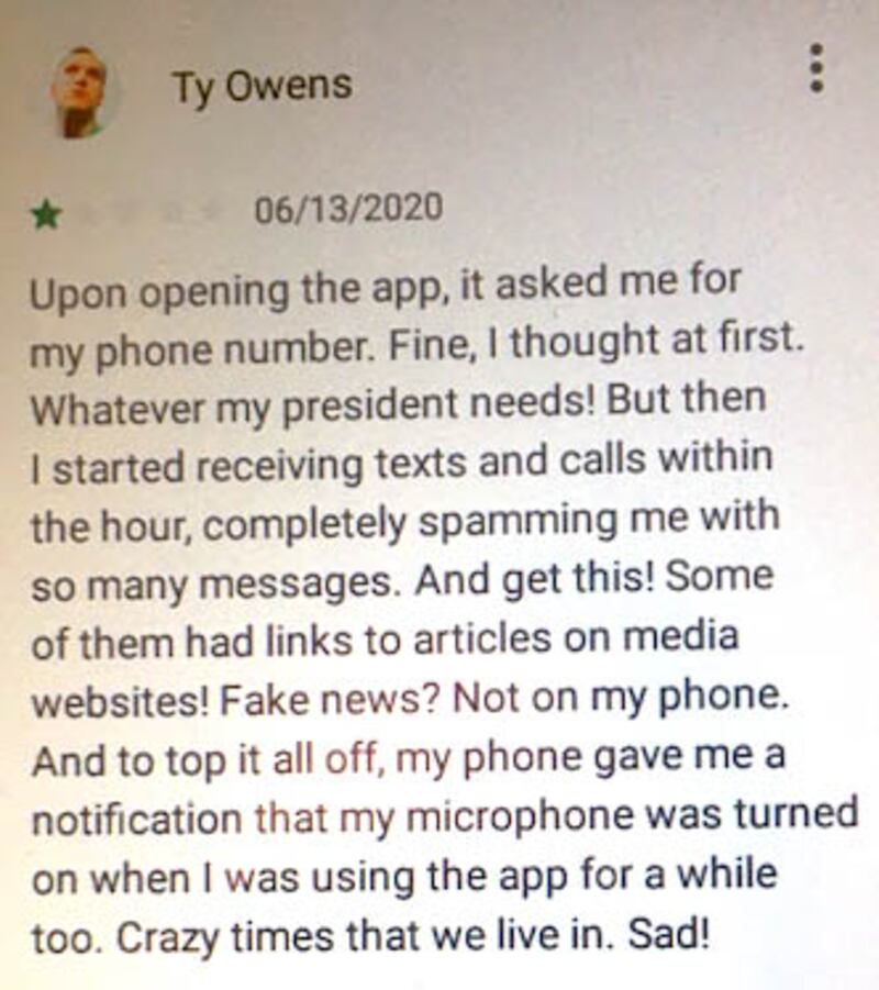 “I would give it 0 stars if I could, “ one user wrote. “A soon as I opened the app my phone started glitching and when I gave it my phone number I constantly got notifications and texts from random people, while I was at a FUNERAL. No matter what I did they wouldn’t stop.” Another user wrote, “Now my phone is all glitchy. I will be uninstalling and never installing it again. Shameful this has the president’s name on it.”