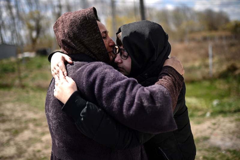 Ukrainian refugees embrace after reuniting on their way back to Ukraine along the Ukrainian-Moldovan border on April 12.