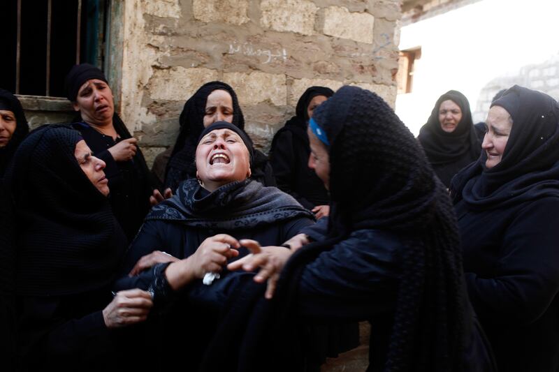 Relatives and neighbors of Egyptian Coptic men who were killed in Libya mourn outside one of their houses in El-Our village. Egyptian jets bombed Islamic State targets in Libya on Monday, a day after the group there released a video showing the beheading of 21 Egyptian Christians, drawing Cairo directly into the conflict across its border.