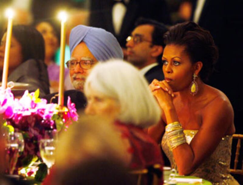 The guest list also included a who’s who of prominent Indian-Americans. CNN chief medical correspondent, Sanjay Gupta, came with his wife, Rebecca, who wore an ornate fuschia silk sari, an image of which the would-be surgeon general threw up on Twitpic earlier in the evening. Film director M. Night Shyamalan turned up, so did Pulitzer Prize-winning author Jhumpa Lahiri. Then again, so did Louisiana Gov. Bobby Jindal—you remember him, from NBC’s 30 Rock.