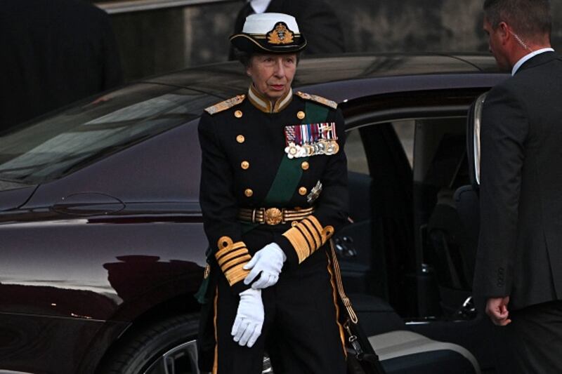 During the duration of the mourning period for Elizabeth II, during which multiple public events will be held in her honor, all working royals are required to wear military uniforms to these occasions, with a few exceptions. Princess Anne, who was with the queen as she died, has been looking notably resplendent in her military garb—in this case, a Royal Navy ceremonial uniform (she is an Admiral in the Navy)—and multiple medals.