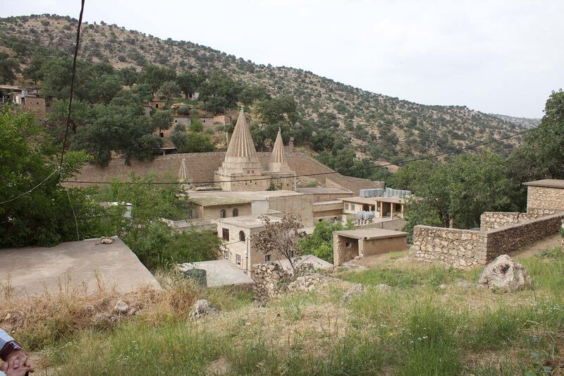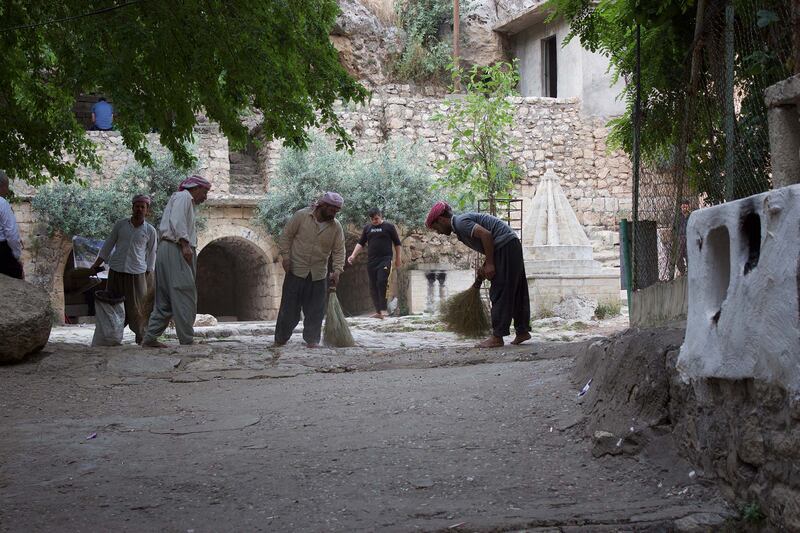 On a hot May morning in 2015, Dinnayi and Blume were sweating in their suits as they ushered the latest batch of survivors from the lobby of a Duhok hotel onto a pair of coach buses idling outside. After a scenic hour-long ride, the buses deposited them in Lalish where the spiritual leader of the Yazidis—a white-bearded, white-robed man called Baba Sheikh—awaited them in a shaded courtyard at the arched entranceway to the ancient sanctuary.