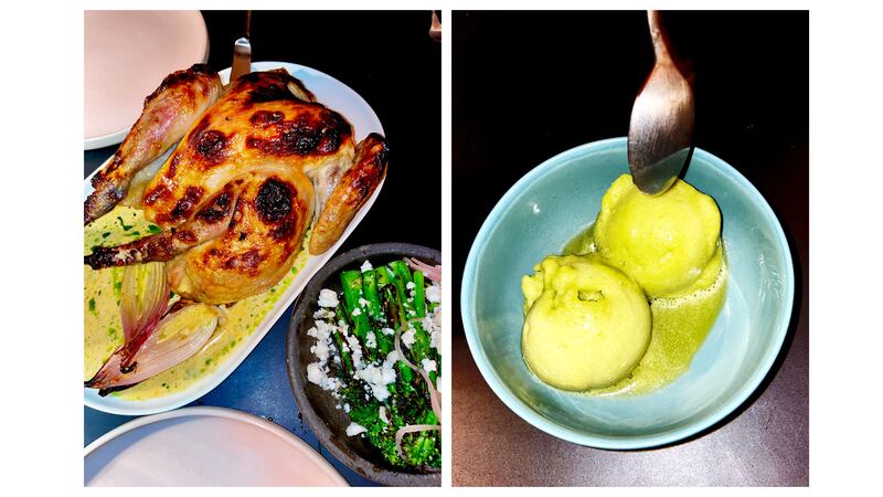 (L to R_ Roasted half guinea fowl, shallot and tarragon, broccoli, Harbourne blue, shallot, and green apple sorbet at The Farmyard Kitchen at The Newt in Somerset.