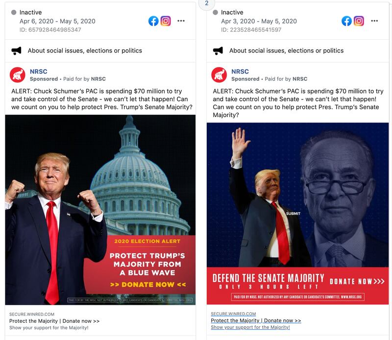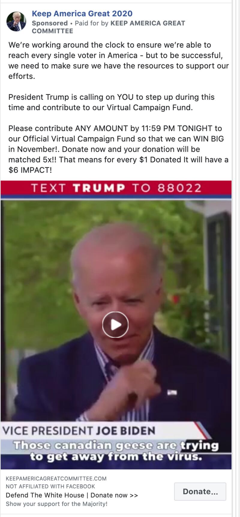 Some of the group’s ads attempted to lure donors with calls to support first responders and essential workers combatting the coronavirus pandemic (the money went toward KAGC, and there’s no indication any was passed on to frontline COVID-19 personnel). But most of the ads are identical to ones run by the Trump campaign and, in a few cases, the National Republican Senatorial Committee.