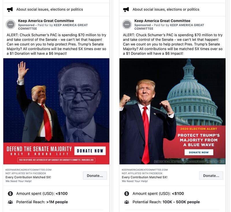 That’s because the vast majority of them are from the Trump campaign. The Keep America Great Committee has run hundreds of paid Facebook posts via two pages on the platform, and most are verbatim copies of ads run by Trump’s re-election team. Many ads even use the same first-person pronouns, referring to “my” presidential campaign and “our” efforts to defeat Joe Biden.