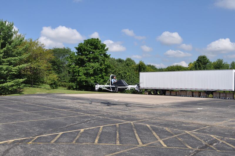 Following the prompts on the console and from Kowitz, I pressed a few buttons and pulled back the lever before rising. It felt surreal as the RECON lifted into the air, like I was breaking some law of man and physics and god by doing this. Wind from the propellers whipped around me as I kept stopping myself from white knuckling the controls completely. Eventually, the vehicle climbed to a whopping 10 or so feet off the ground. While it was nowhere near the 400 foot ceiling, it felt like I might as well have been in orbit.