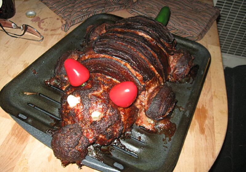 The pièce de résistance of the gross-foods movement, the Porkgasm, submitted by readers Zach Spier and Catherine Schon, consists of a “pig” made out of eight different types of pork (from sausage to bacon to ham to pork belly), reconstructed into a porcine shape and smoked for three hours.