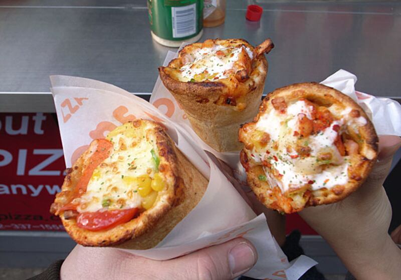“This is a real thing, and it is really popular in Seoul,” says Amason. “They serve pizza in these little boxes and it comes cone-shaped, like a glorified calzone.”