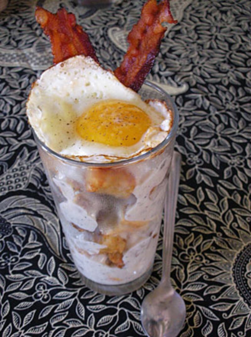 Another real menu item, this winner “contains all the elements of a country breakfast shoved into a cup as a parfait would be.” Those elements include tater tots, fried eggs, chicken-fried steak bites, buttermilk biscuit chunks, sausage gravy, and bacon.