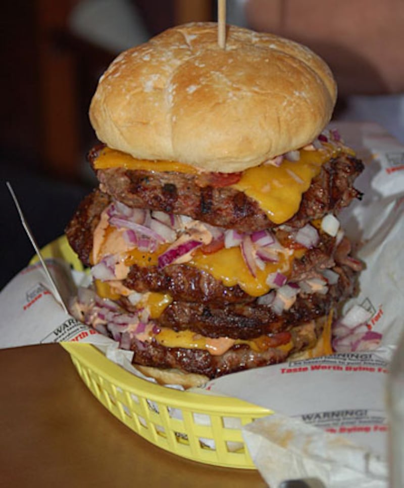 “This is an actual menu item at the Heart Attack Grill in Chandler, Arizona,” says Amason. “The best part is all the waitresses and cooks serve you the bypass burger dressed up as sexy nurses, and if you finish it, you get a T-shirt, and get wheeled to your car in a wheelchair by the staff.”