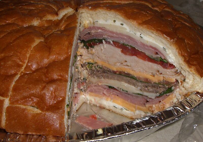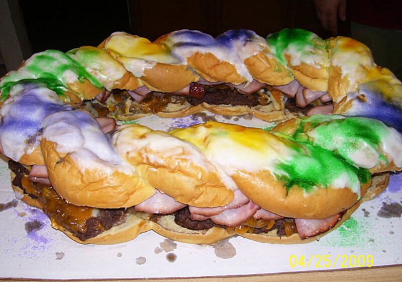 This “next level sandwich” comes from a reader in New Orleans, who decided to open up a traditional Mardi Gras king cake, and shove sausages, bacon, and cheeseburgers inside.