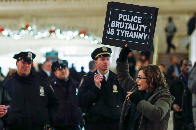 A woman passes by NYPD officers during a 2014 protest demanding justice for the death of Eric Garner.