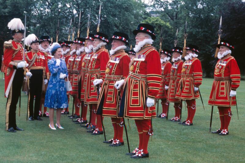 Queen Elizabeth II reviews her Yeoman of the Guard, the world's oldest military corps, on the grounds of Buckingham Palace, London, June 8, 1978.