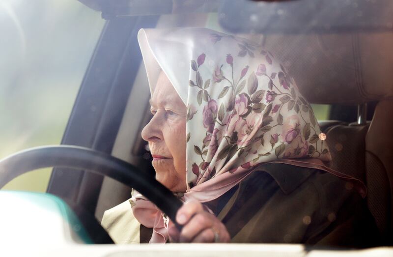 Queen Elizabeth II drives herself in her Range Rover as she attends day 3 of the Royal Windsor Horse Show in Home Park on May 10, 2019, in Windsor, England.