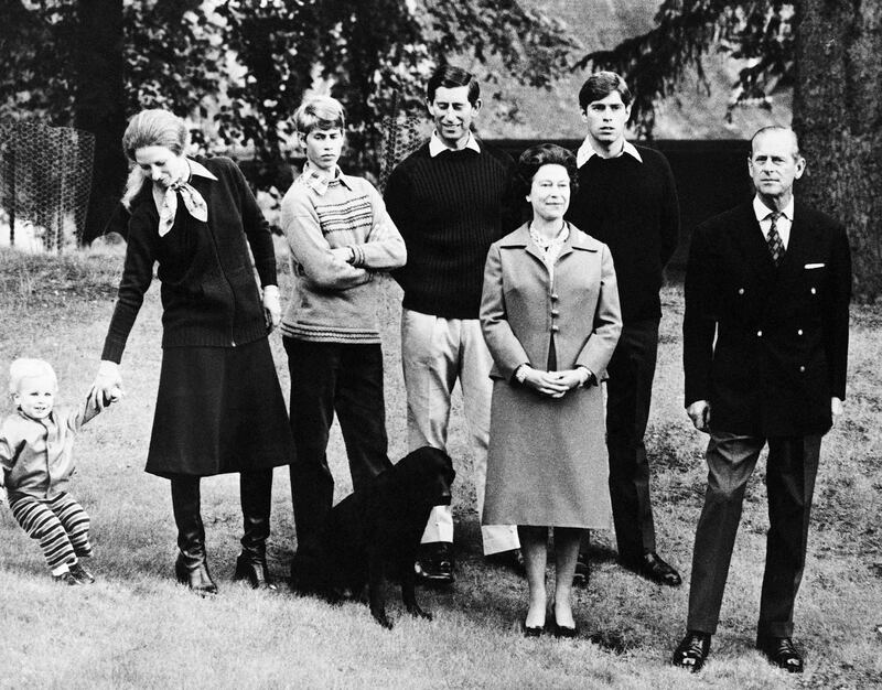 Queen Elizabeth II and the Duke of Edinburgh celebrate 32 years of marriage on Nov. 20, 1979, in Scotland, with Prince Andrew, Charles, the Prince of Wales, Prince Edward, and Princess Anne with her son Master Peter Phillips.