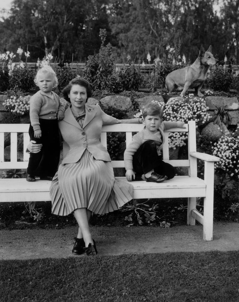 Queen Elizabeth sitting with her children, Charles and Anne, and a royal corgi in the garden of Balmoral Castle in Scotland, September 28, 1952.