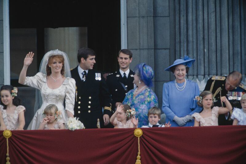Members of the British royal family on the balcony at Buckingham Palace after the wedding of Prince Andrew and Sarah Ferguson on July 23, 1986.