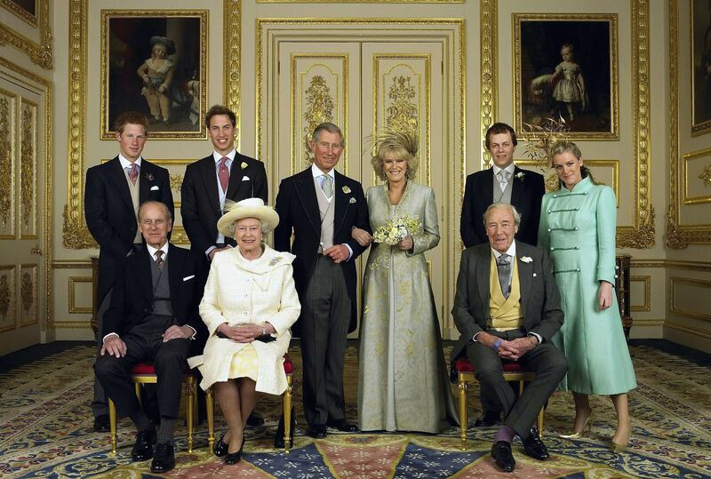 Prince Charles and Camilla Parker-Bowles pose for the Official Wedding photograph with their children and parents in the White Drawing Room at Windsor Castle following their marriage, Saturday, April 9 2005, in Windsor, England.