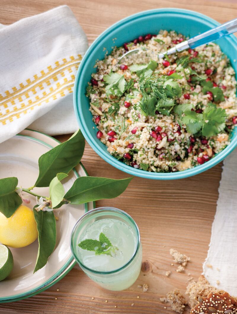 Pomegranate, nut, and green herbquinoa