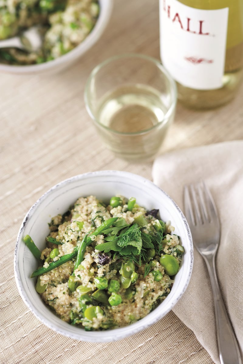 1. Heat the olive oil in a saucepan over low heat. Add the onion and garlic and sweat for about 4 minutes, until softened.2. Add the quinoa, give it a good stir, and let it toast for about a minute. You’ll hear it start to crackle.3. The next steps are the same ones you’d follow with risotto: Add the liquid in thirds to let the quinoa soak up each batch of liquid before the next addition. First add the wine and a bit of salt and let the liquid cook out, stirring occasionally, about 4 minutes. When there’s almost no more liquid in the pot, add 1 cup of the stock, give it a good stir, and again let that cook out gently for another 5 minutes or so, stirring occasionally, then repeat with the remaining cup of stock. These steps will take about 15 minutes. If at the end of the 3 additions of liquid the quinoa isn’t completely cooked, add a bit more stock and cook it out until the quinoa is done to your taste.4. Add the green beans, peas, lima beans, asparagus, fava beans, and 1/2 cup water to the pan. If there’s no liquid in the pan, add more to allow the ingredients to cook a little more easily and to keep the dish moist. Turn the heat up a little and partially cover the pan to give the vegetables a cook.5. When the vegetables are cooked and bright green, remove the saucepan from the heat. Add the crème fraîche, Parmesan, and lemon juice and check the seasoning.6. Just before you’re about to serve, throw in all the beautiful herbs and stir well.