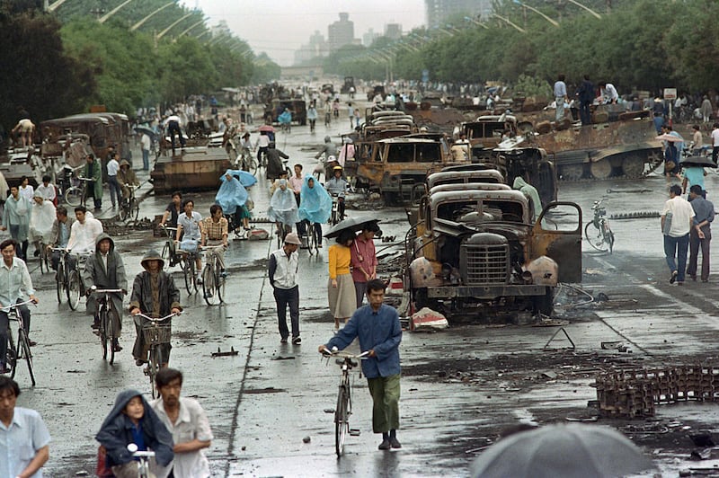 The aftermath of the protests and massacre at Tiananmen Square in 1989. Estimates have placed the death toll from several hundred to several thousand.