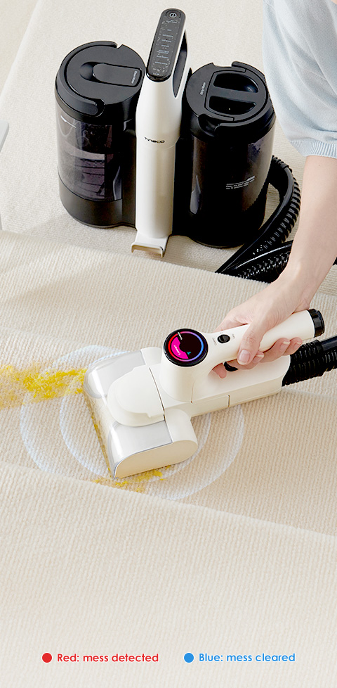 The Carpet One Spot Smart Cordless Carpet and Upholstery Spot Cleaner is a compact, portable, and cordless multi-surface cleaner engineered to tackle tough stains and areas of concern. The cleaner is equipped with Tineco’s iLoop technology, a smart sensor that can detect a spot (indicated by a red light) and notify you with a blue light when the spot has been cleared. No more touching the stain to test dampness or posing to see the spot from as many angles as possible to see if it's still there. . Other premium features include a motorized brush which essentially does all the scrubbing for you, and a self-cleaning function to clean the brush and hose after each use.