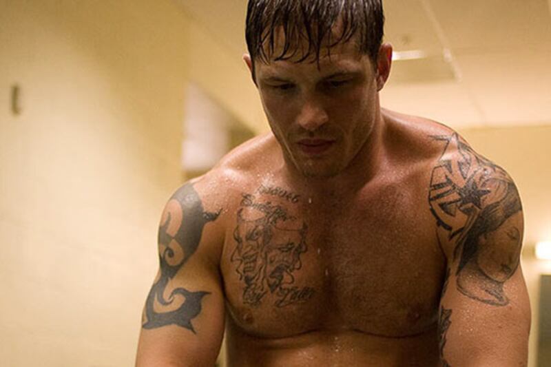 His relationship with his parents provided some of the motivation for him to take on the role of Tommy Reardon in filmmaker Gavin O’Connor’s (Miracle) underdog mixed-martial-arts drama Warrior. Reardon, an ex-Marine whose abusive, alcoholic father (played by Nick Nolte) abandoned him and his mother, returns to his blue-collar hometown of Pittsburgh years after her death and enters into a winner-take-all mixed-martial-arts tournament with a grand prize of $5 million. In the final, he matches up against his estranged brother, played by Aussie Joel Edgerton (Animal Kingdom). Hardy, whose gripping performance as the troubled brawler has shades of Brando in On the Waterfront, says he’s “terrified of men” and “hates” fighting, but he’s gotten into “silly fights that you see when somebody yells at a bar, and then another person yells at a bar, and then people start windmilling.” The 5-foot-10-inch star bulked up to 179 pounds—he’s now at 187 for his Bane role—by a resistance-training technique called signaling, whereby he arm-wrestles or does sit-ups against his trainer, who varies the resistance against him. Also, he lifted weights with his teeth to bulk up his neck and trapezius muscles.