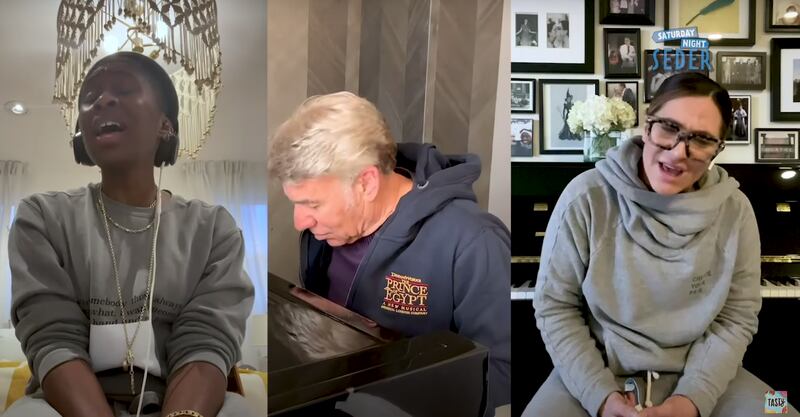 But nothing yet has topped, or frankly may ever top, the biggest treat of the new celebs-from-their-homes trend: Powerhouse vocalists Cynthia Erivo and Shoshana Bean performing the Mariah Carey-Whitney Houston duet “When You Believe” from The Prince of Egypt during the Saturday Night Seder fundraiser while composer Stephen Schwartz accompanied on piano.