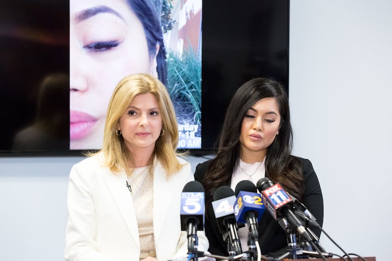 Andrea Buera (R), who is accusing Trey Songz of assaulting her, speaks during a press conference with her attorney Lisa Bloom (L) at The Bloom Firm on March 13, 2018, in Woodland Hills, California.