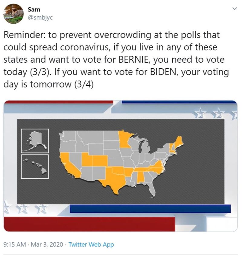 "Reminder: to prevent overcrowding at the polls that could spread coronavirus, if you live in any of the states and want to vote for BERNIE, you need to vote today (3/3). If you want to vote for BIDEN, you voting day is tomorrow (3/4)" one account tweeted early Tuesday,” one account wrote in a now-deleted tweet featuring a map of Super Tuesday states.